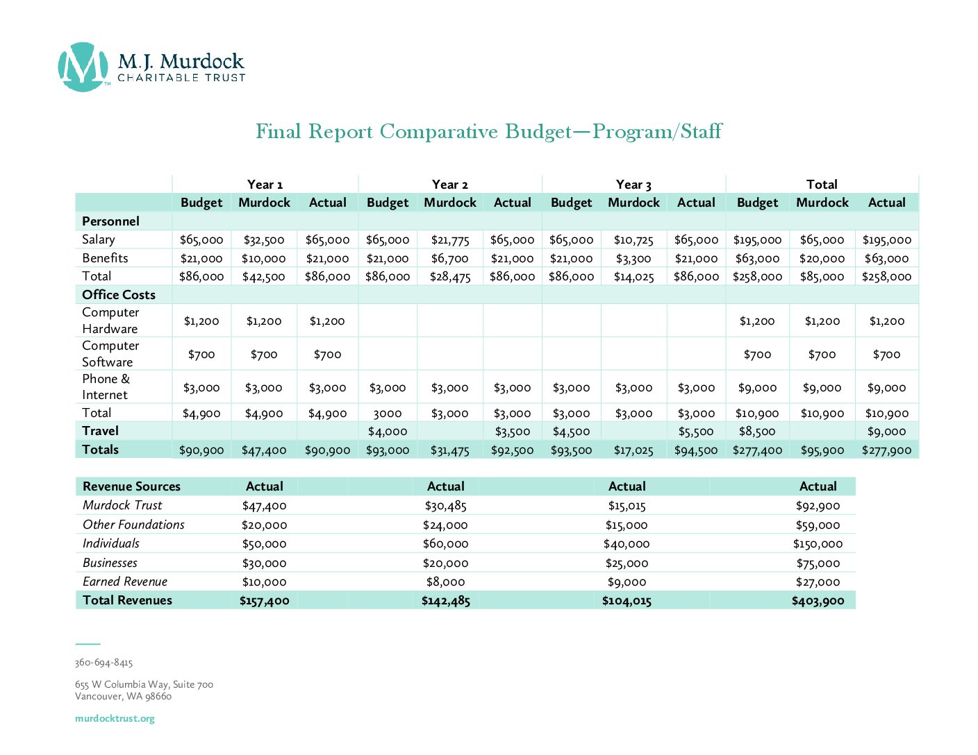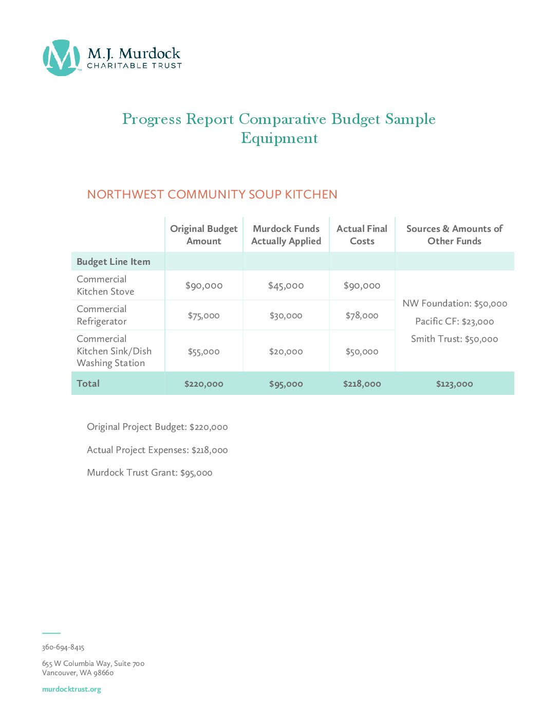 - Budget—The budget should reflect all costs and the entire amount of the Trust award. Referencing the budget that was presented with the proposal (or a later approved revision), clearly describe how Trust grant funds have been used. See examples below: