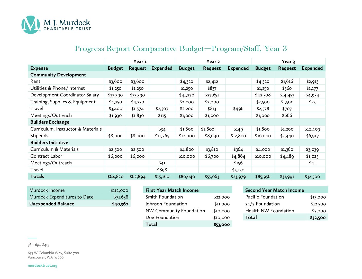 - in a 1:2 match of $50,000, Murdock will make a $50,000 grant payment when the grantee has raised $100,000